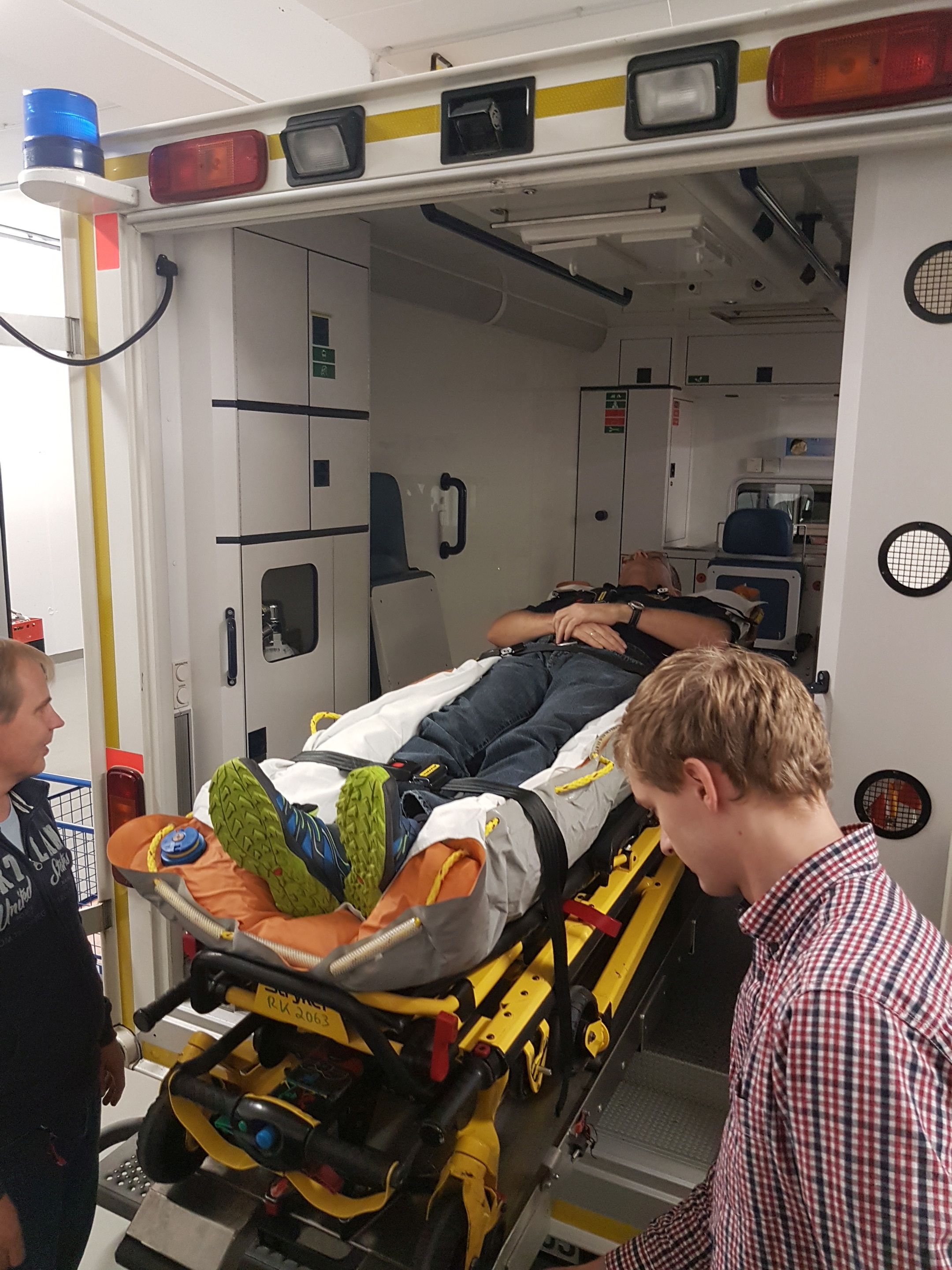 Dazu wurden wir in die Bedienung der Fahrtrage eingewiesen, so dass wir -während das Rettungsdienstpersonal den Patienten versorgt- ggf. die Ausrüstung im Einsatz aus dem Rettungswagen holen und beim Patientenlagern helfen können.