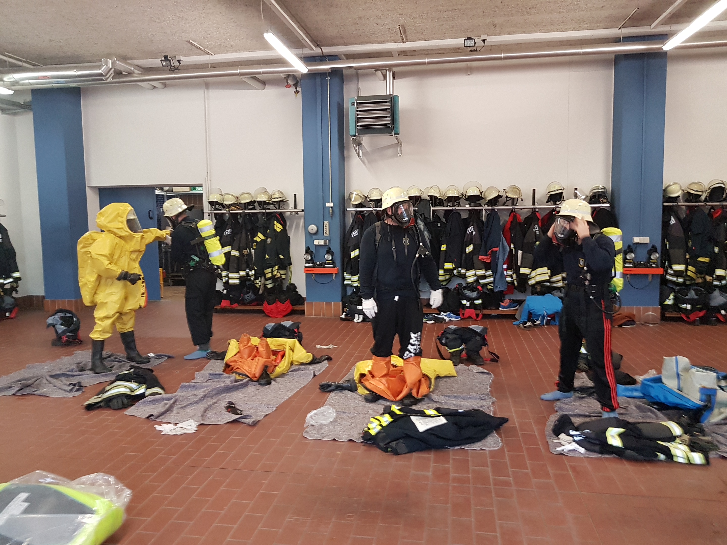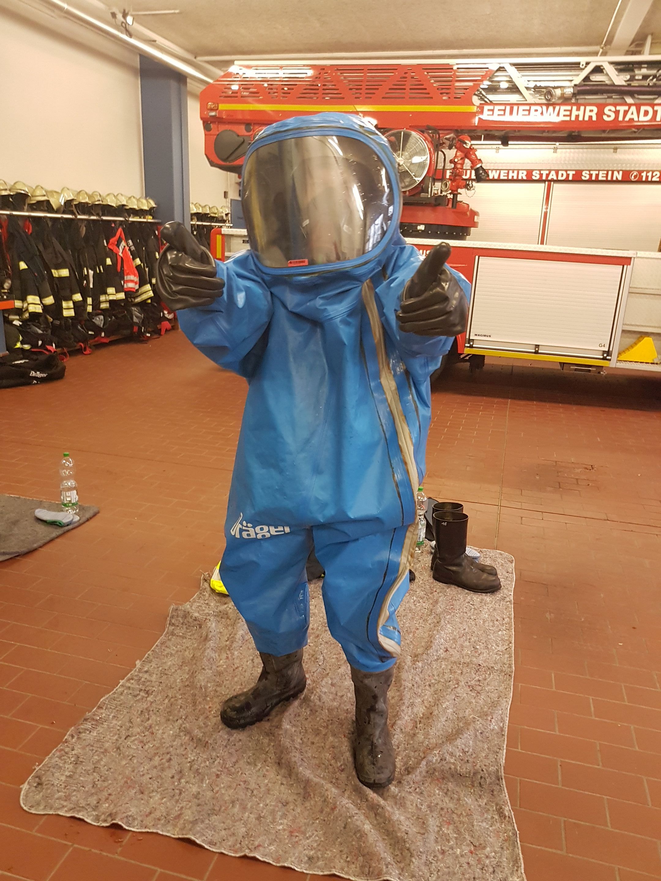 Getragen wird der Chemikalien-Schutzanzug über einem normalen Trainingsanzug und dem Feuerwehrhelm sowie dem Atemschutzgerät.