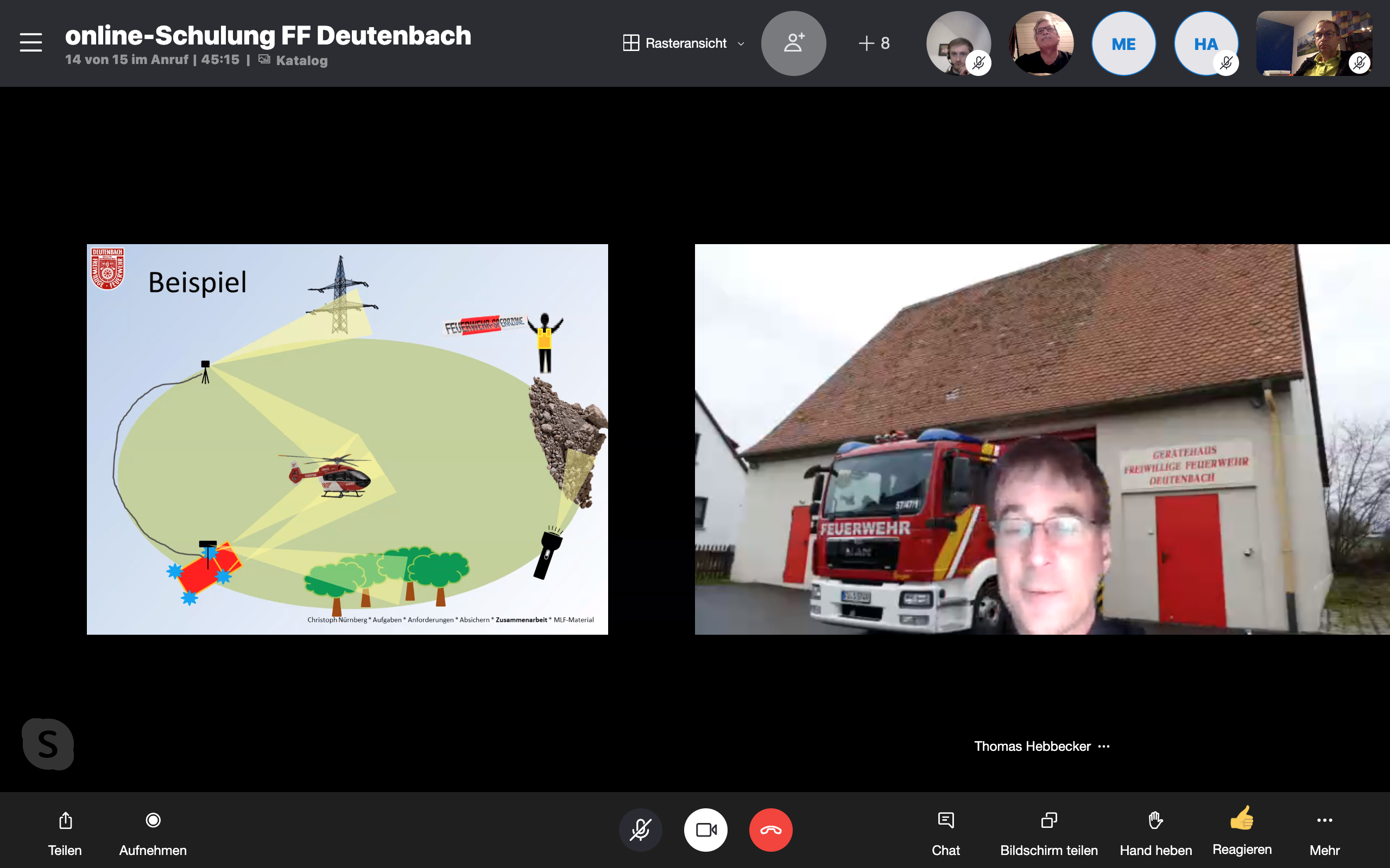 Sicherlich mal eine andere aber derzeit auch gar nicht unübliche Art der Ausbildung; aber in der aktuellen Situation war es doch schön, die Kameradinnen und Kameraden nicht nur spontan beim Einsatz sondern auch mal wieder in Ruhe zu sehen - wenn auch nur virtuell.