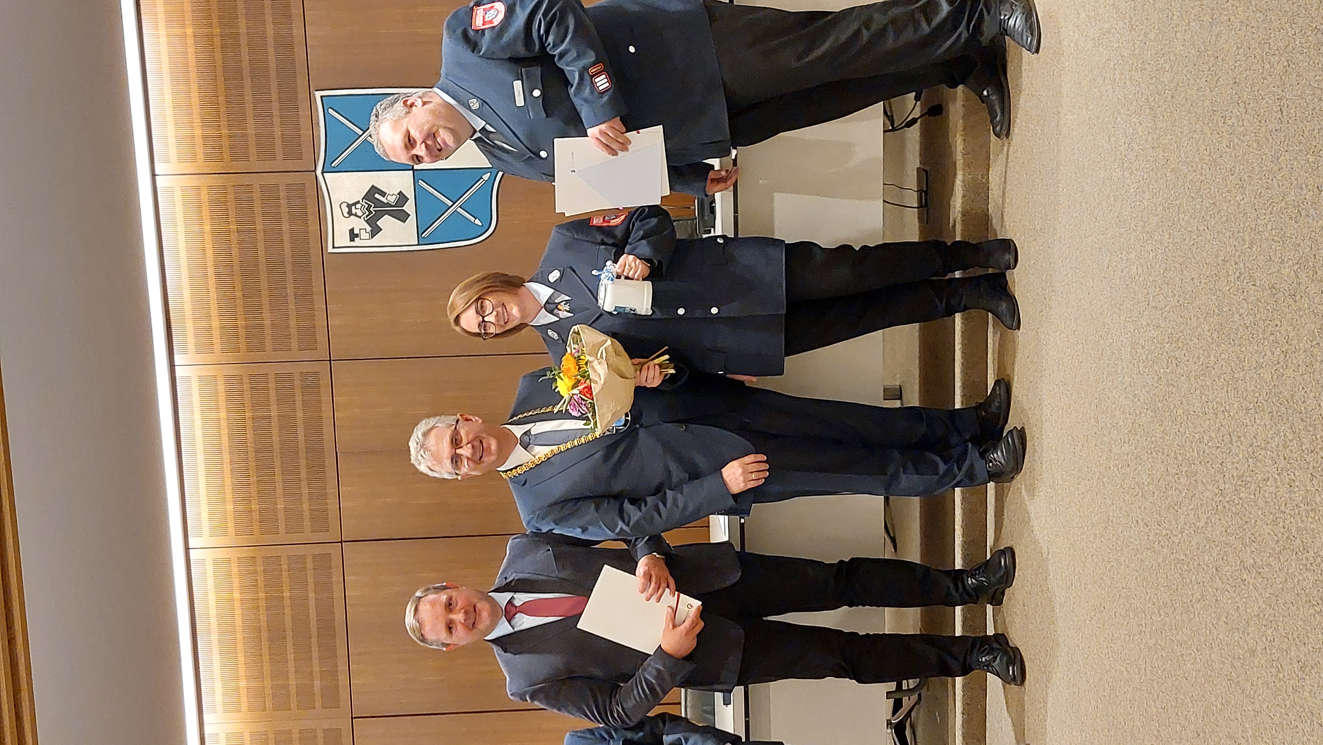 Dabei zeichnete Landrat Bernd Obst unsere Kameradin Stefanie Bergmann mit dem silbernen für 25 Jahre und Peter Lösel mit dem goldenen Ehrenabzeichen für 40 Jahre aktive Mitgliedschaft aus. Auch 1. Bürgermeister Kurt Krömer drückte bei der Veranstaltung im Rathaus seinen Dank für das Engagement zum Wohl der Steiner Bevölkerung aus und überreichte an die Jubilare und ihre Partner Präsente.
