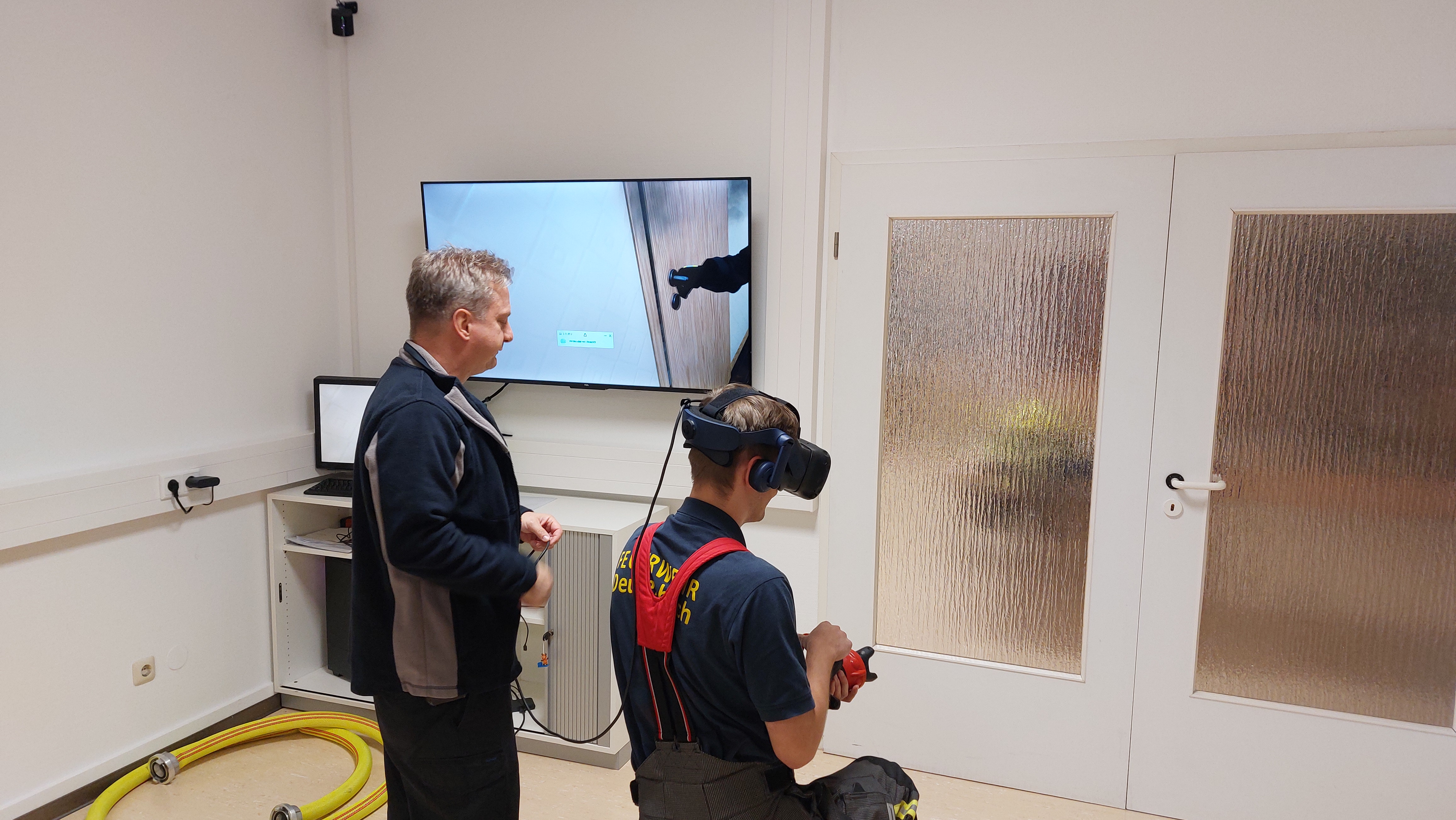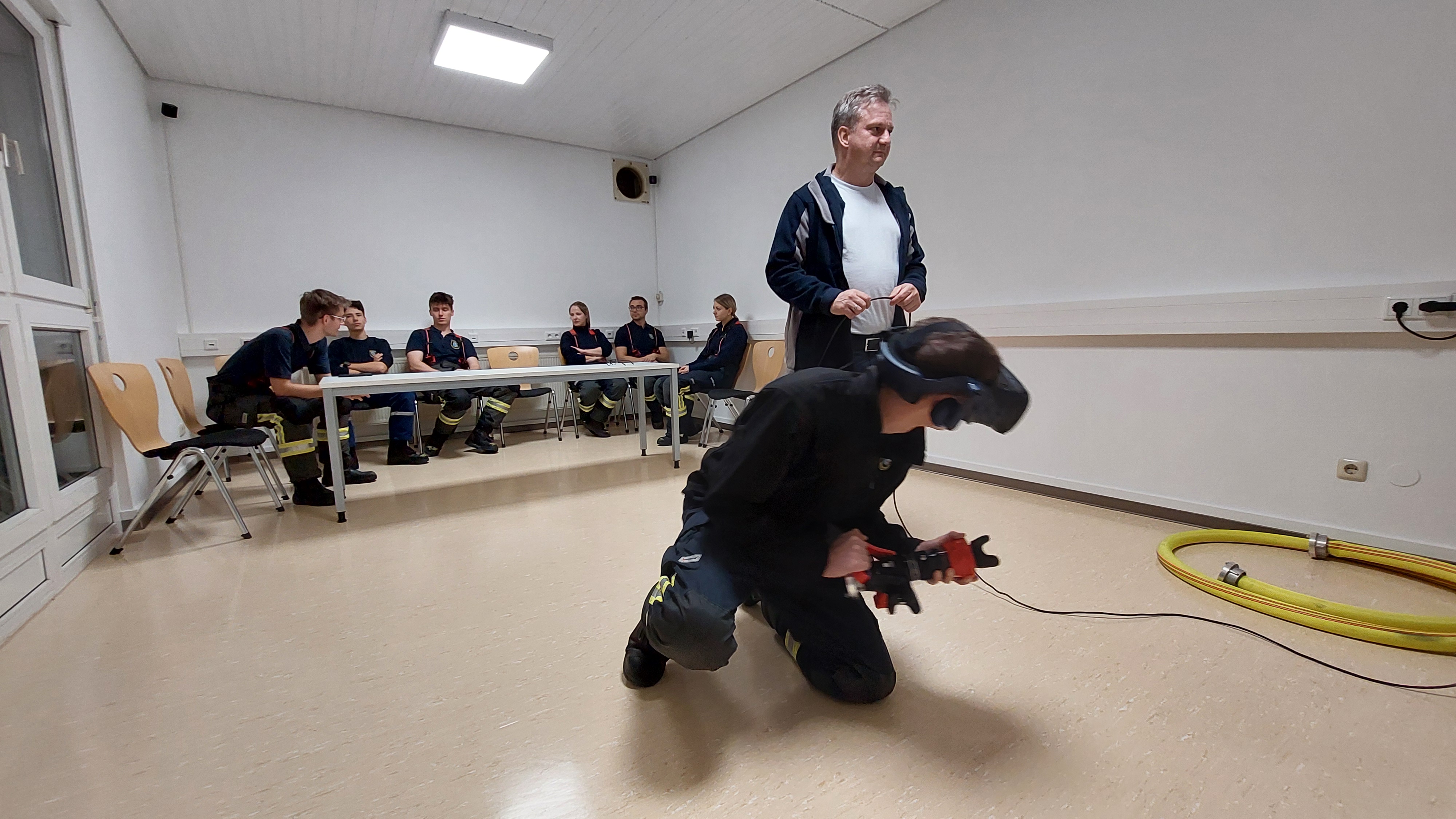 Direkt im Anschluss ging es für einige aktive und angehende/ potentielle Atemschutzgeräteträger zum Feuerwehrausbildungszentrum der Kreisbrandinspektion Landkreis Fürth. Dort übten sie nach einer kurzen Einweisung durch KBM Frank Stegmann mit dem virtuellen Strahlrohrtrainer.
