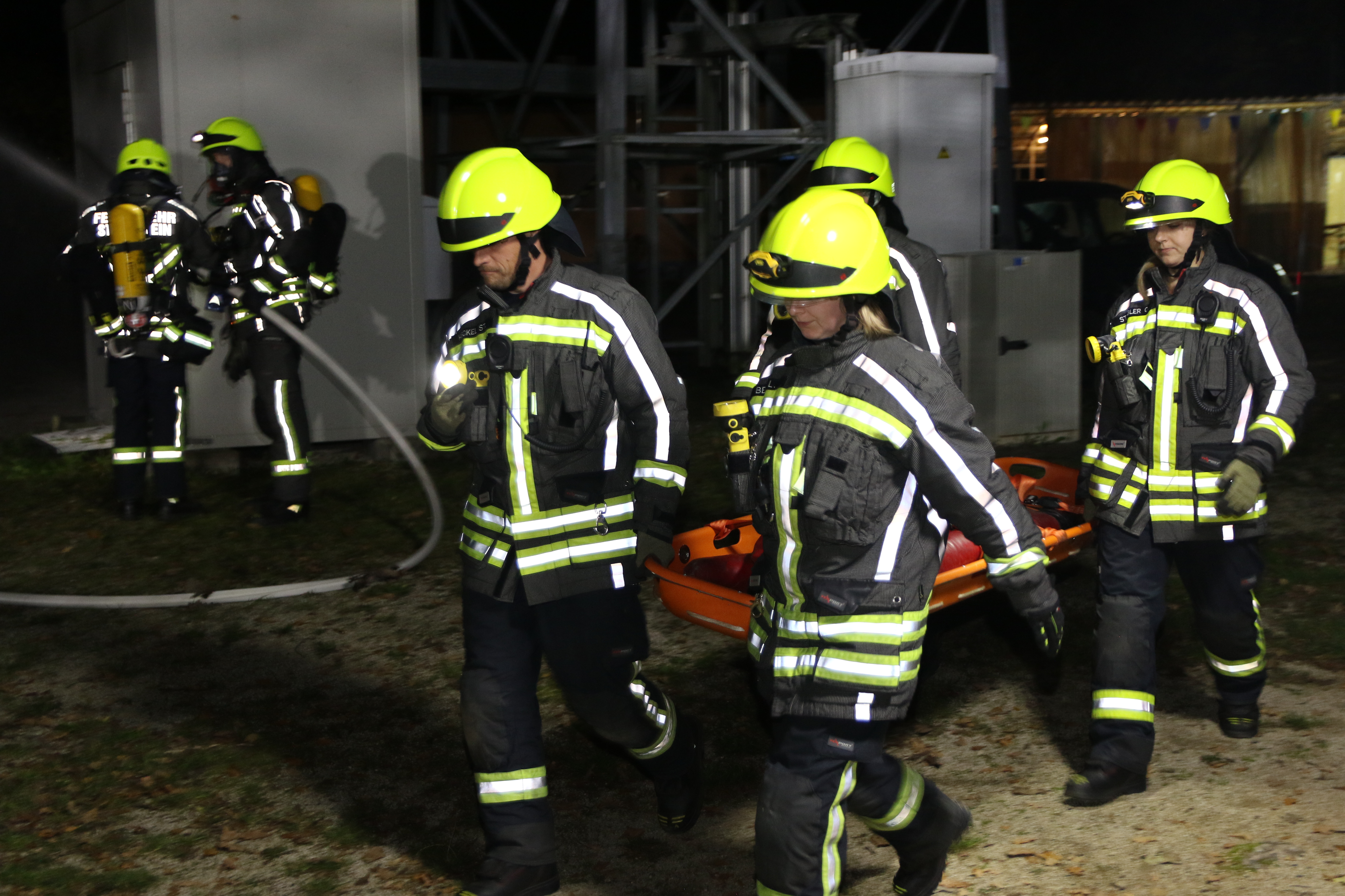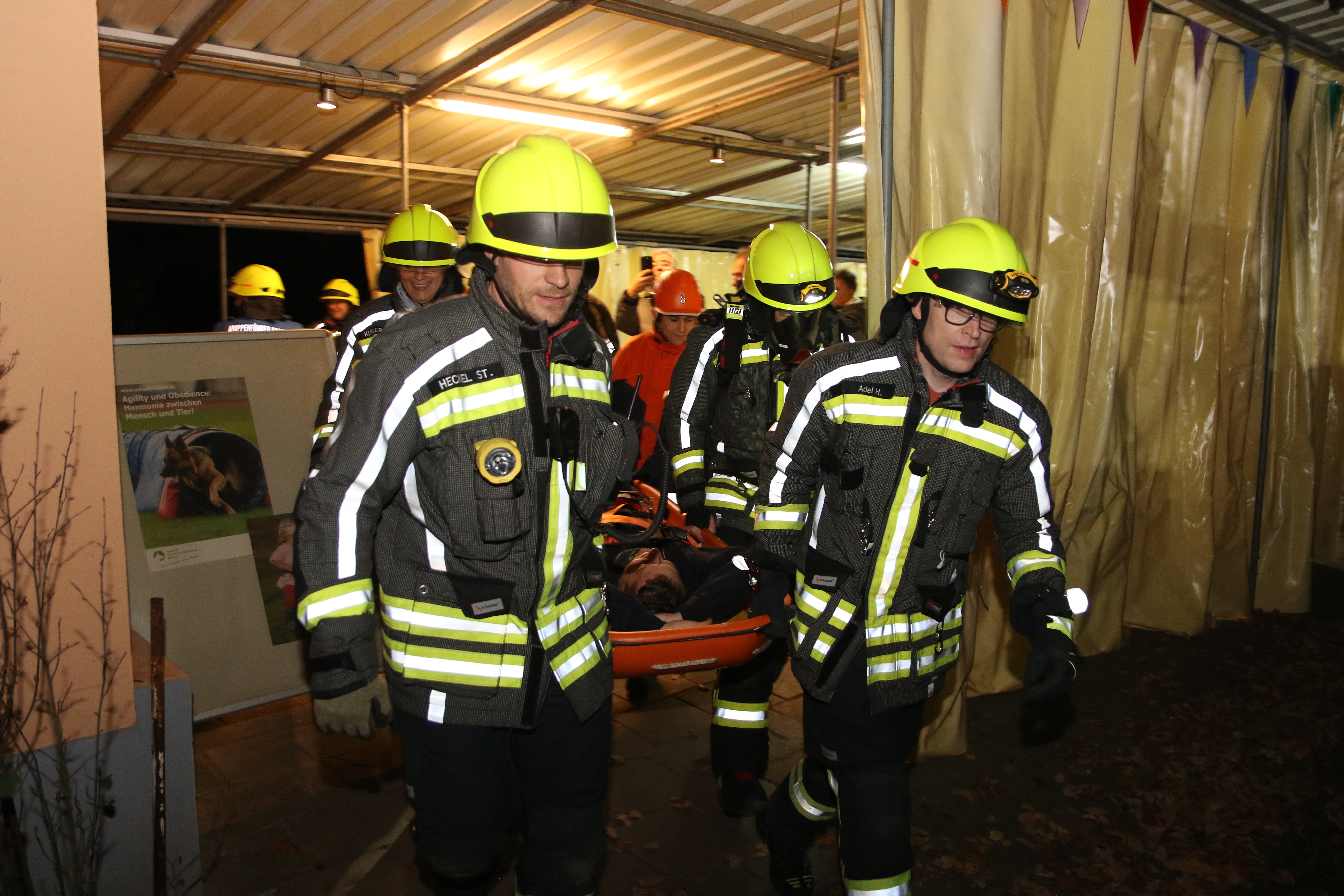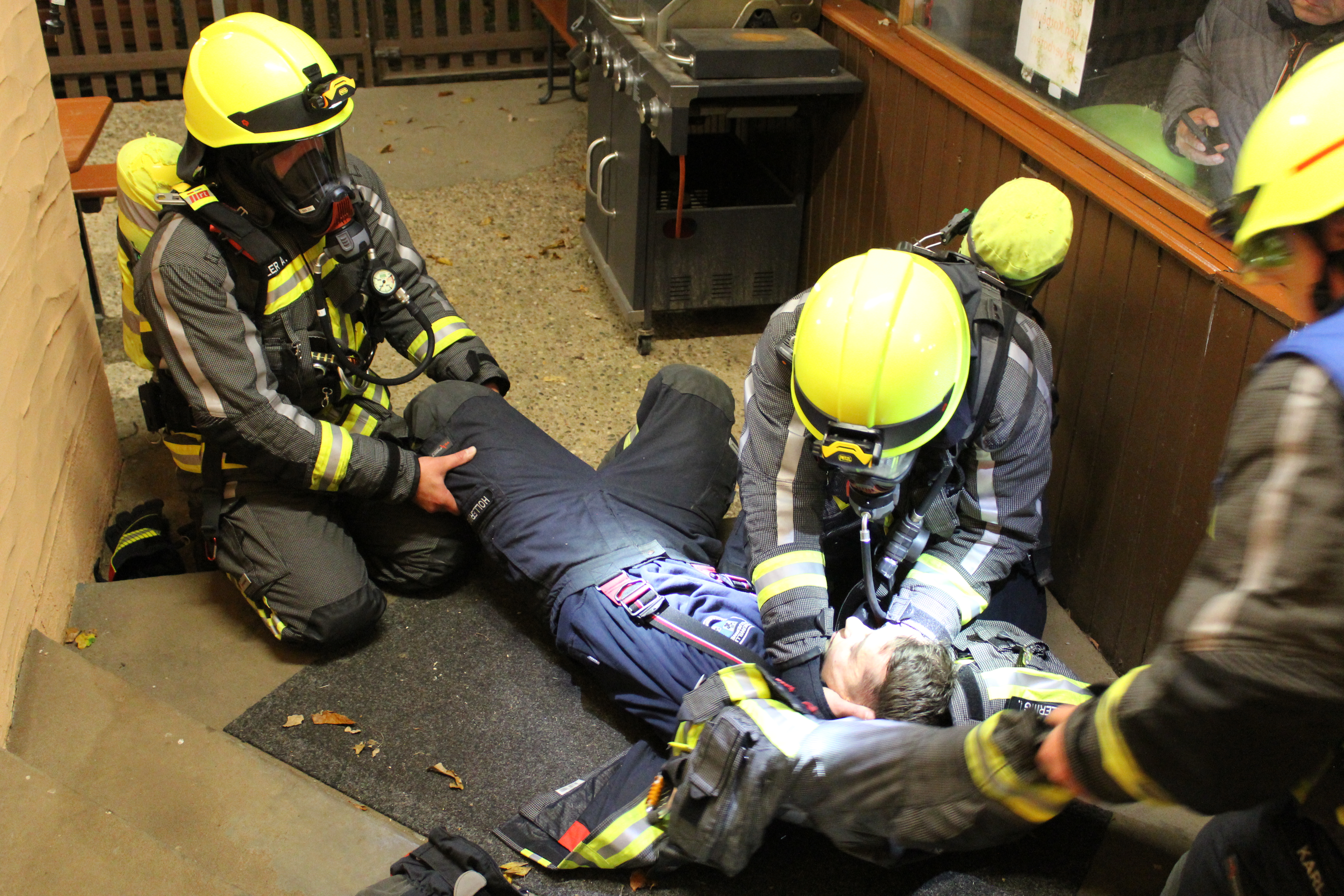 Im weiteren Verlauf der Gebäudeabsuchung kam es zu einem Atemschutznotfall, so dass hier der verletzte Kamerad durch den Sicherheitstrupp (FF Bertelsdorf) gerettet und versorgt werden musste.