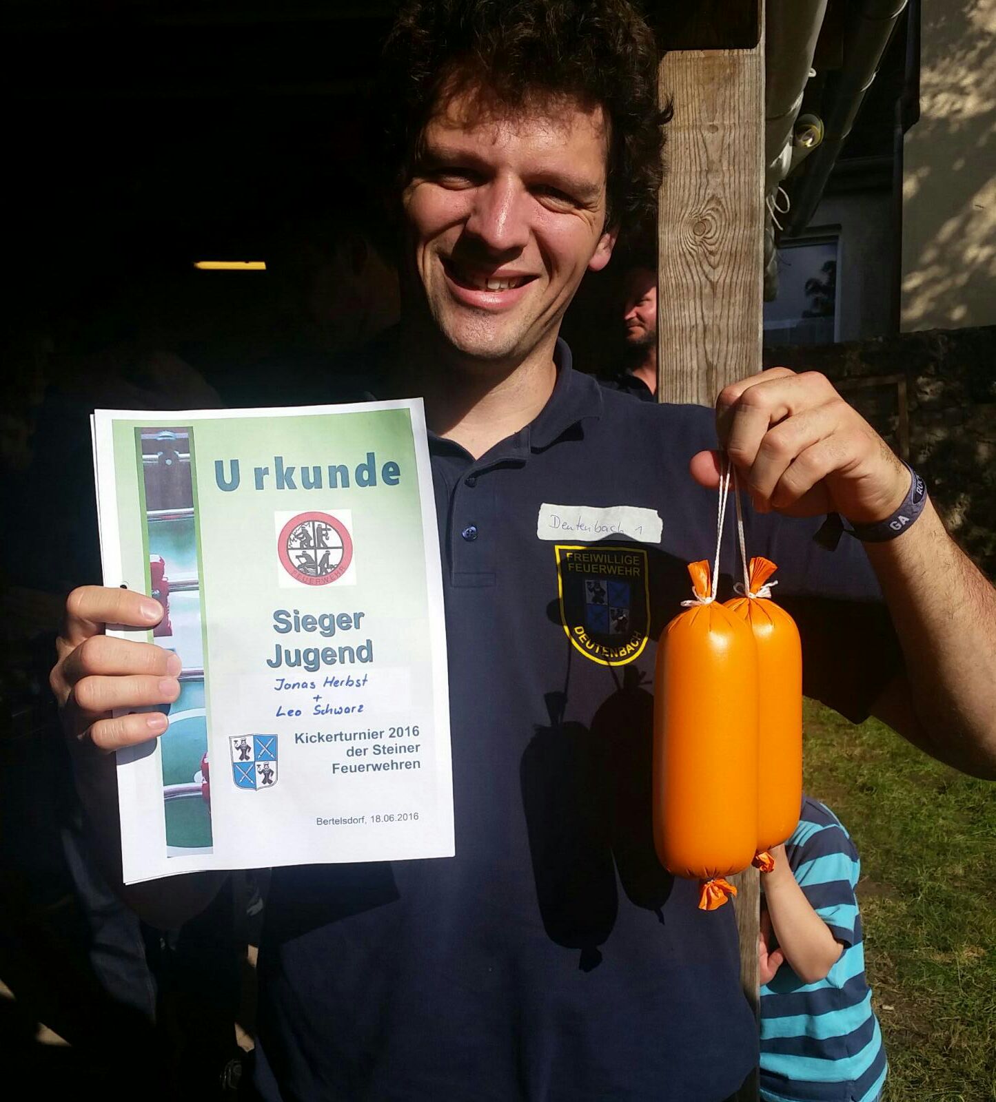 Auch die FF Deutenbach trat mit drei Teams an - während Team 1+2 sich an den olympischen Gedanken hielten, schaffte es das Team 3 mit Jonas Herbst und Leo Schwarz dann immerhin bis ins Viertelfinale und wurde sogar noch als bestes Jugendteam mit Urkunde und Gelbwurst ausgezeichnet.