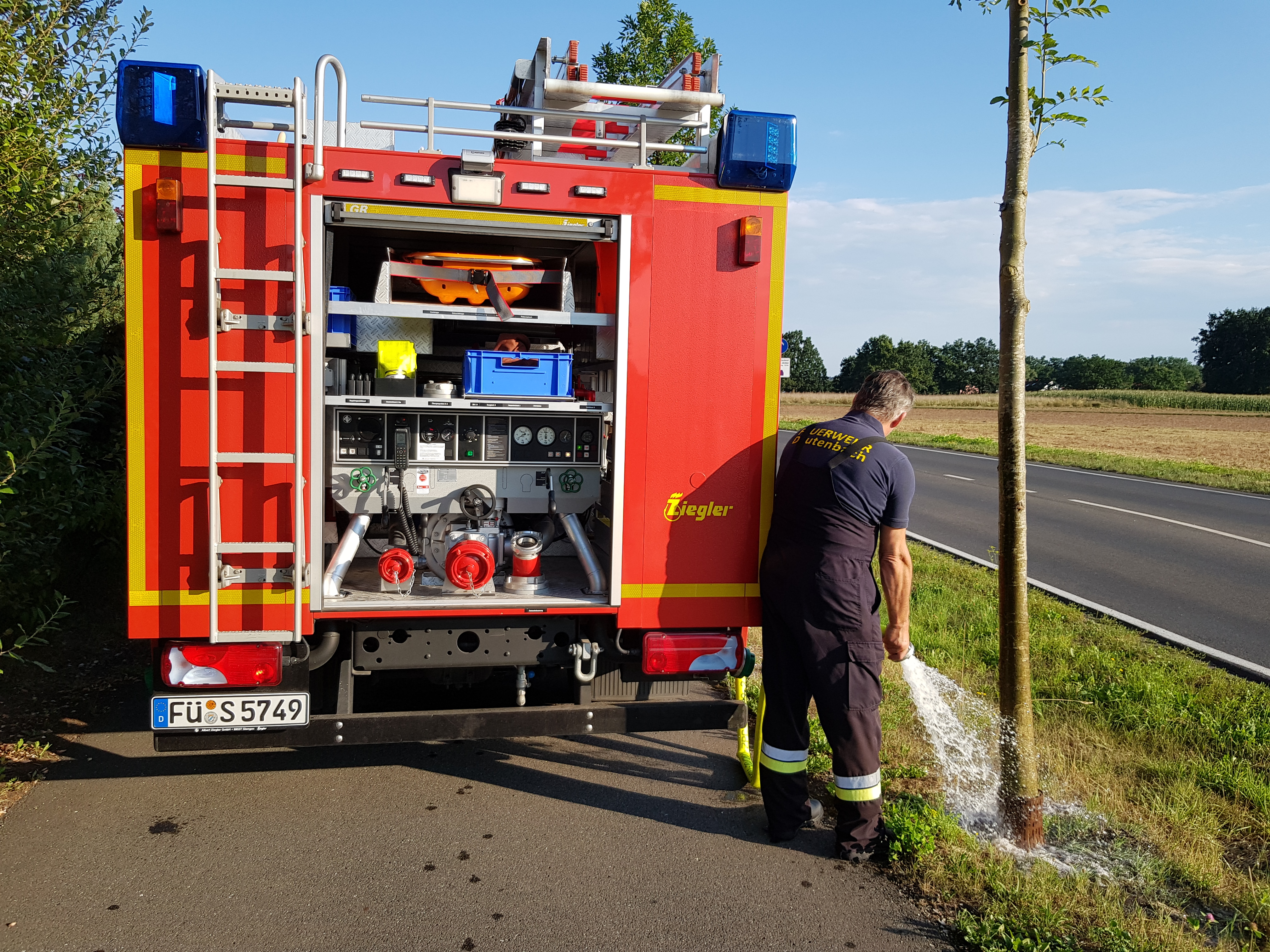 Einsatzbericht Aufgrund der großen Hitze in den letzten Wochen haben wir uns bereiterklärt, einige Bäume im Stadtgebiet mit Wasser zu versorgen. Bei dieser Gelegenheit konnten wir auch gleich den Vorrat in unserem Löschwassertank austauschen.