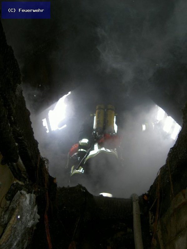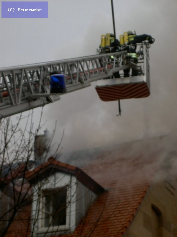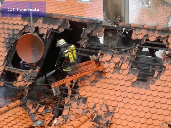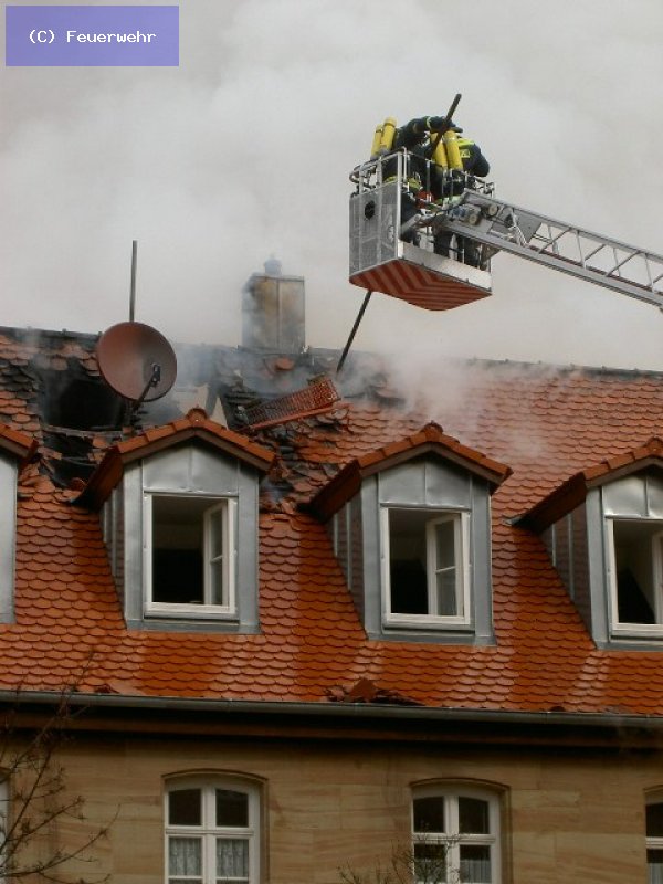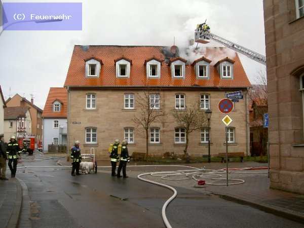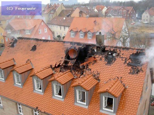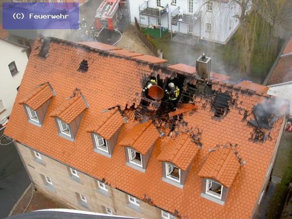 Aus bisher noch ungeklärter Ursache war ein von fünf Wohnparteien genutztes Mehrfamilienhaus in Brand geraten. Dabei wurde der Dachstuhl komplett zerstört. Zur Unterstützung wurden die Steiner Ortsfeuerwehren Weihersbuch und Deutenbach nachgefordert. Mit zwei C-Rohren im Innenangriff, sowie einem Wasserwerfer von der Drehleiter aus, wurde das Feuer bekämpft. Zusätzlich wurde mit einem Einreißhaken die Dachhaut geöffnet. Gegen 10:24 Uhr konnte „Feuer aus“ gemeldet werden. Mit der nachgeforderten Wärmebildkamera des Landkreises Fürth wurden noch Glutnester aufgespürt, so dass die Nachlöscharbeiten noch andauerten.