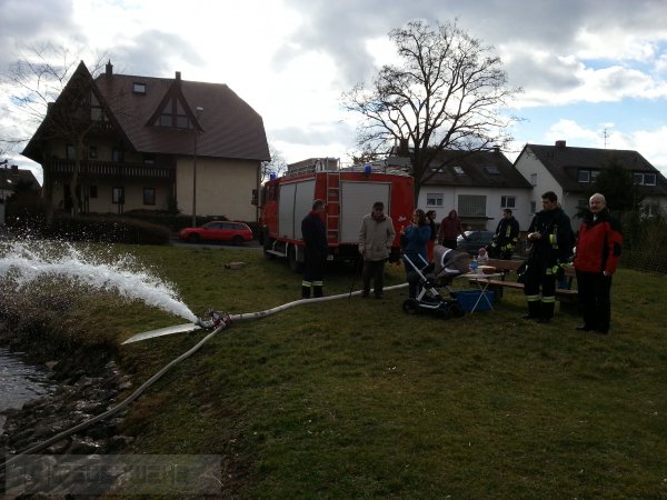 Aufgrund eines Auftrages durch das Stadtbauamt der Stadt Stein übernahm die FF Deutenbach die Aufgabe, den Weiher in der Weizenstraße wieder mit Wasser zu befüllen.