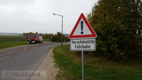 Die FF Stein und Deutenbach wurden zum Reinigen der durch ausgelaufene Gülle verschmutzten Straße im Bereich Kreisverkehr B14/ Hofäckerweg alarmiert.