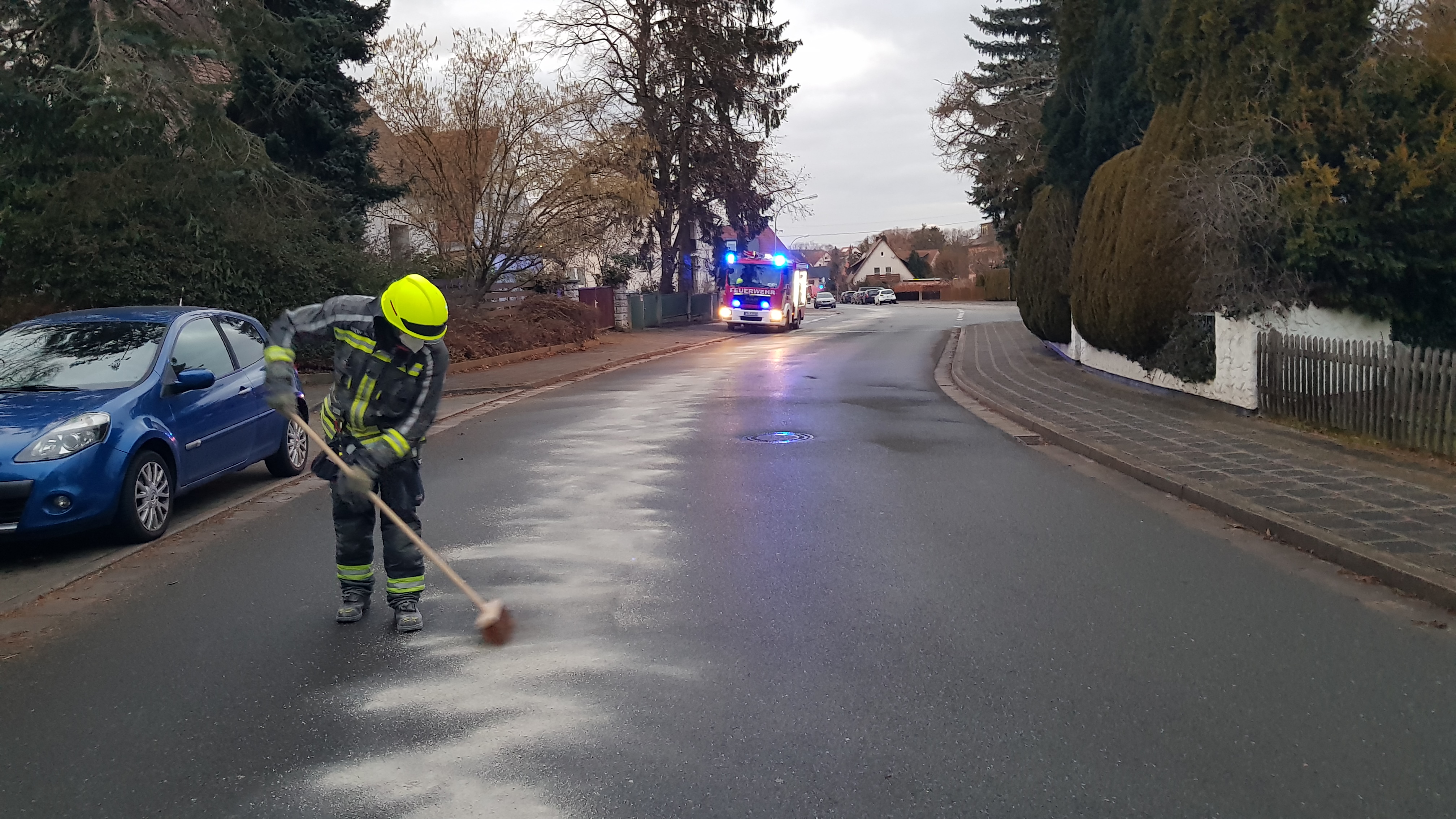 Eine längere Kraftstoffspur vom Hofäckerweg über Neuwerker Weg und Jagdweg musste von den Kameraden aus Stein und uns abgestreut werden.