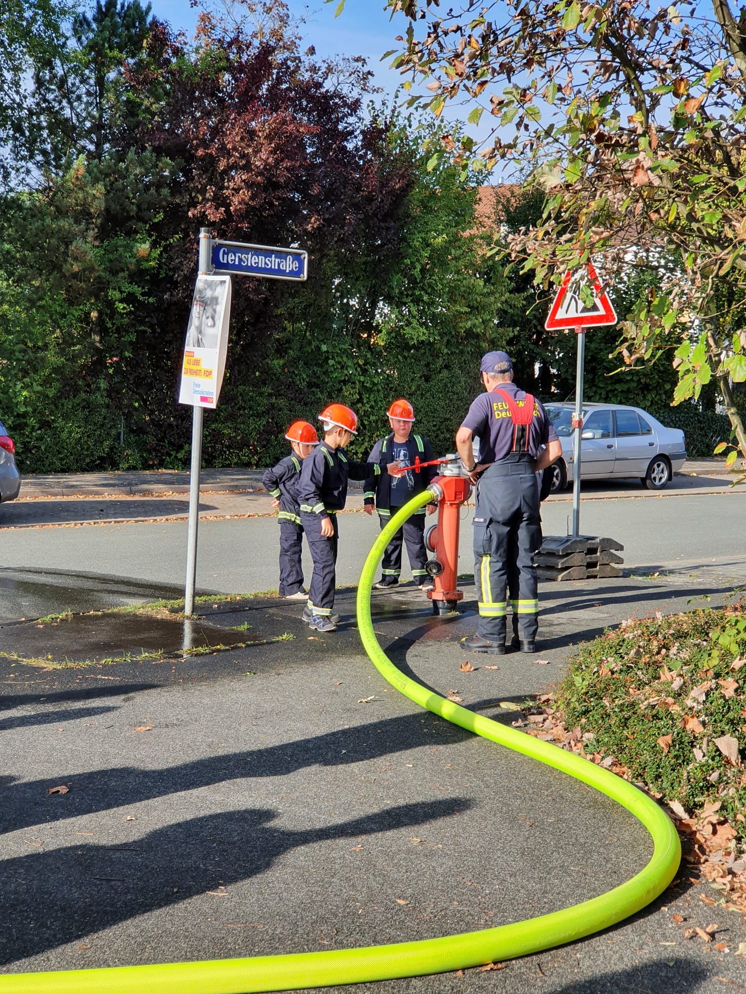 Dort wurde schrittweise erklärt, wie ein sogenannter Löschgruppenaufbau vom Hydranten über die Pumpe bis zum Strahlrohr erfolgt. Natürlich haben wir das auch unter Anleitung und mit Unterstützung praktisch umgesetzt - und das unter den neugierigen Augen von zahlreichen jungen und junggebliebenen Zuschauern, die sichtlich neidisch auf dieses wunderbare Hobby waren (aber wir haben da noch ein paar Spinde frei! 😉):